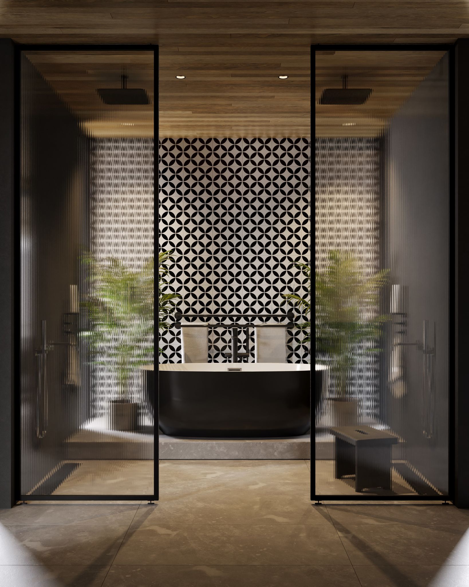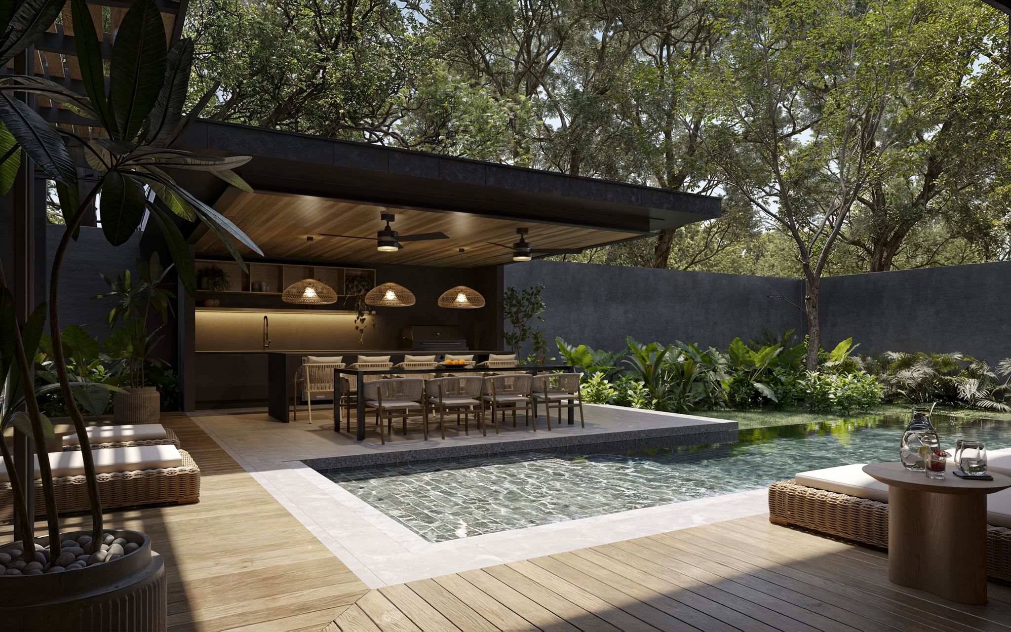 Architectural Integrity: Minimalist tropical design with natural materials, polished concrete, soft wood tones, and perfect proportions.
