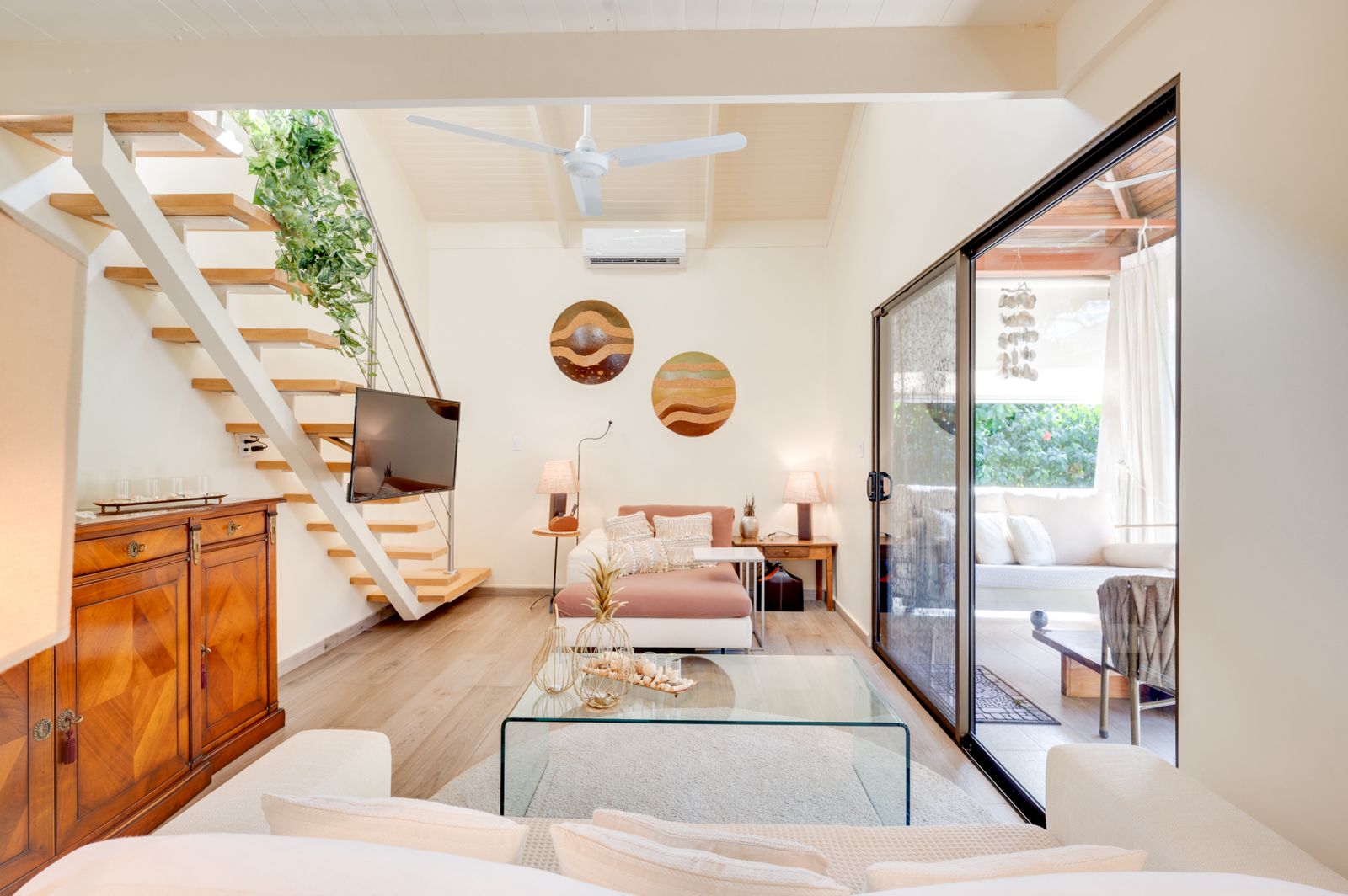 Outdoors, enjoy a shaded terrace perfect for morning coffee, a BBQ area beneath a mango tree, and a private deck lounge for sunset gatherings.